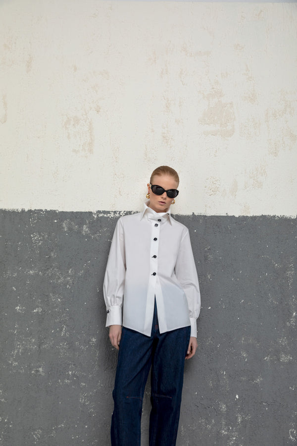 Structured White Poplin Blouse with Contrast Buttons