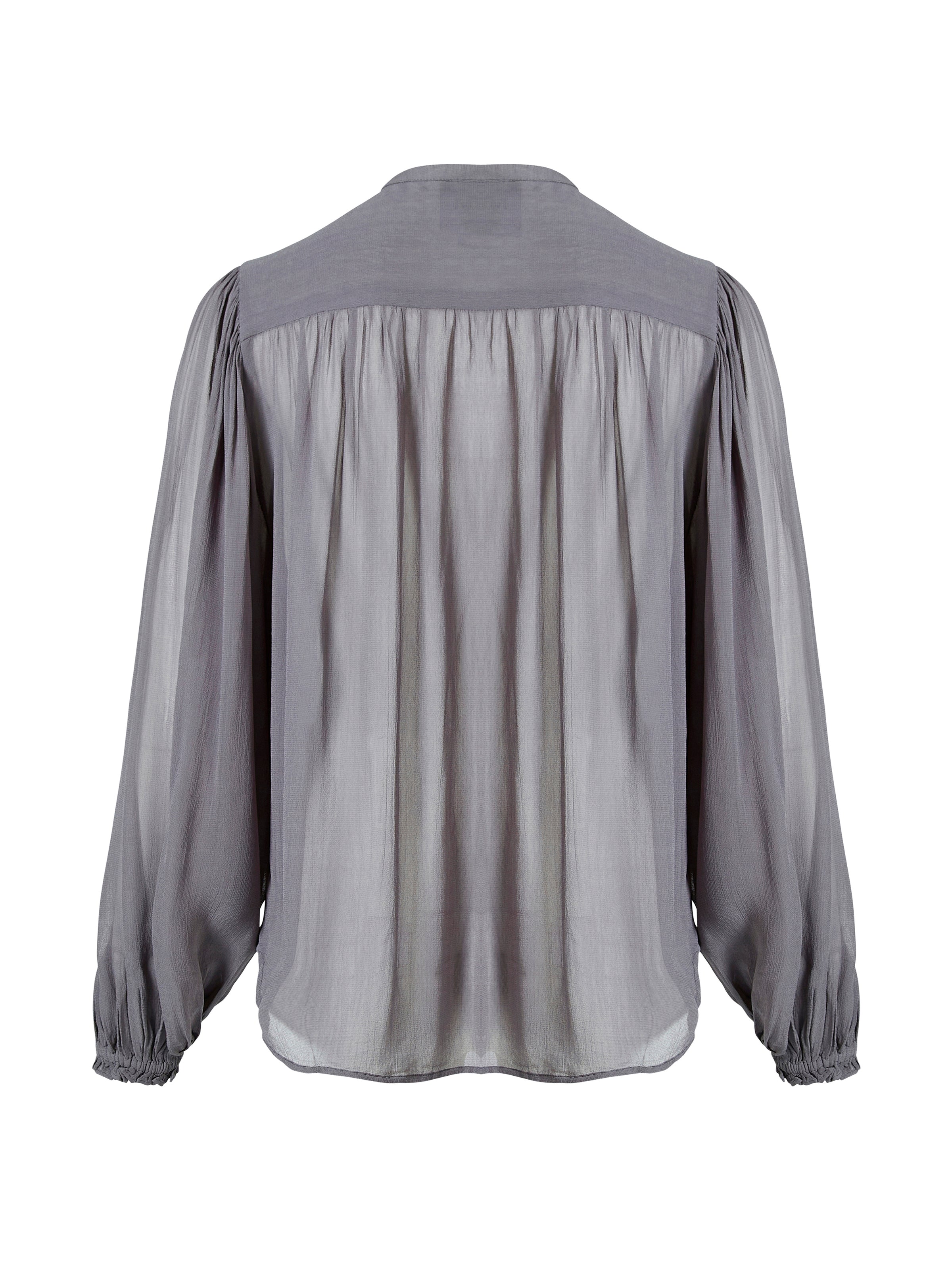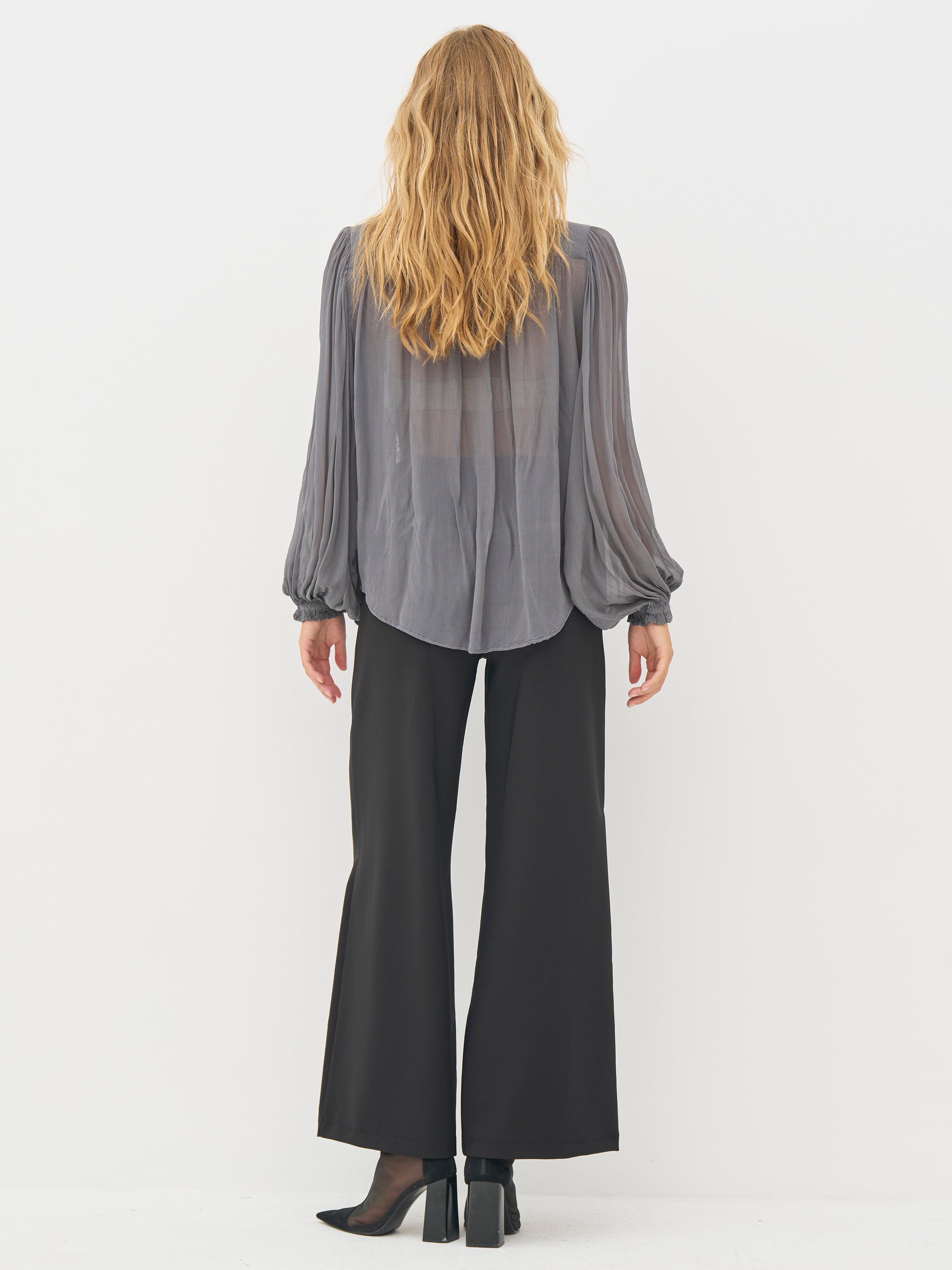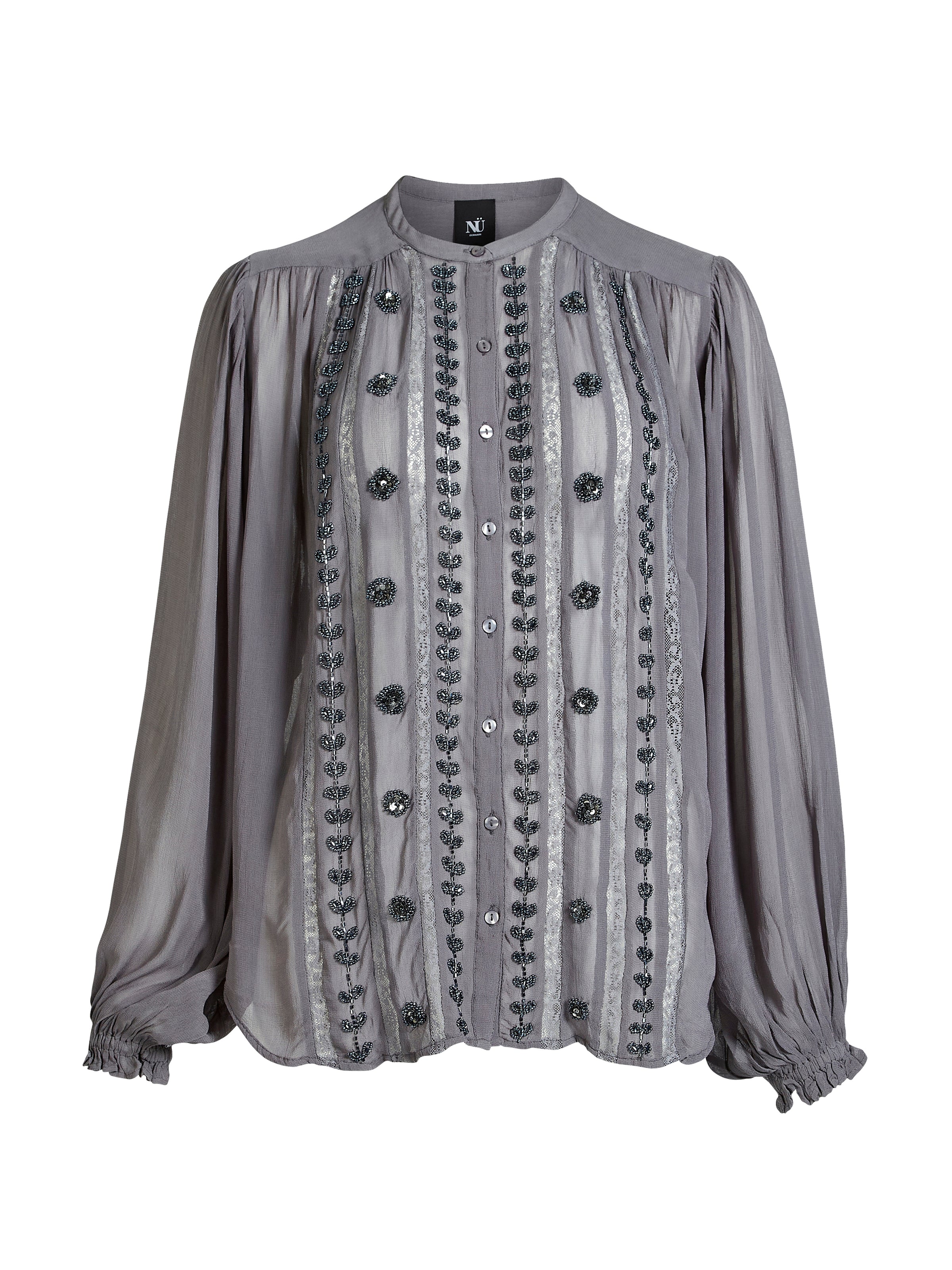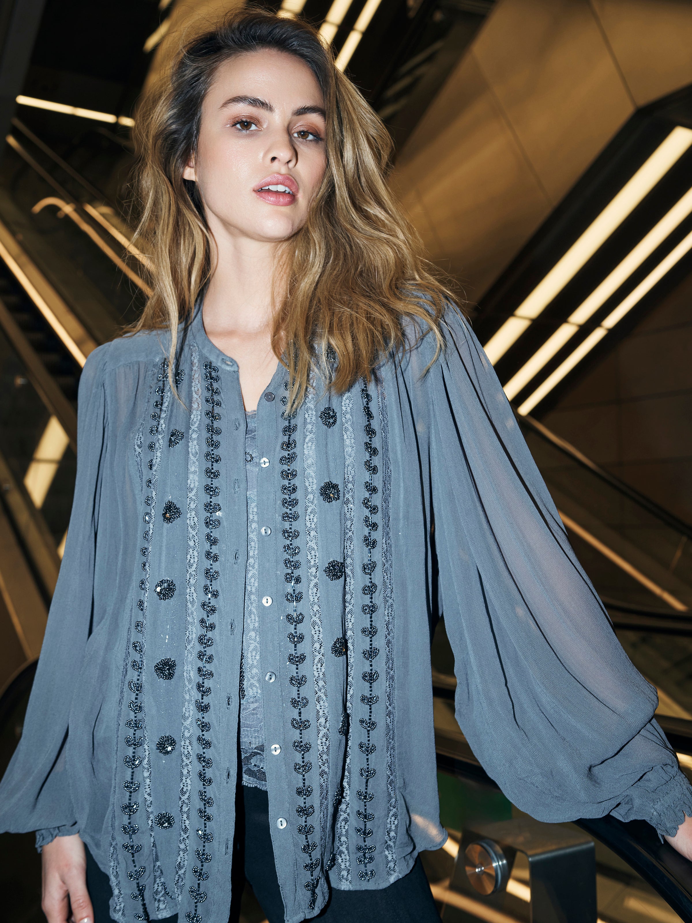 This shirt combines a feminine expression with delicate details. It features a light, transparent material and is embellished with vertical ribbons and embroidered flowers on the front, adding a unique and elegant touch. The long sleeves are finished with elastic cuffs, creating a soft volume, and the shirt fastens with buttons all the way down.