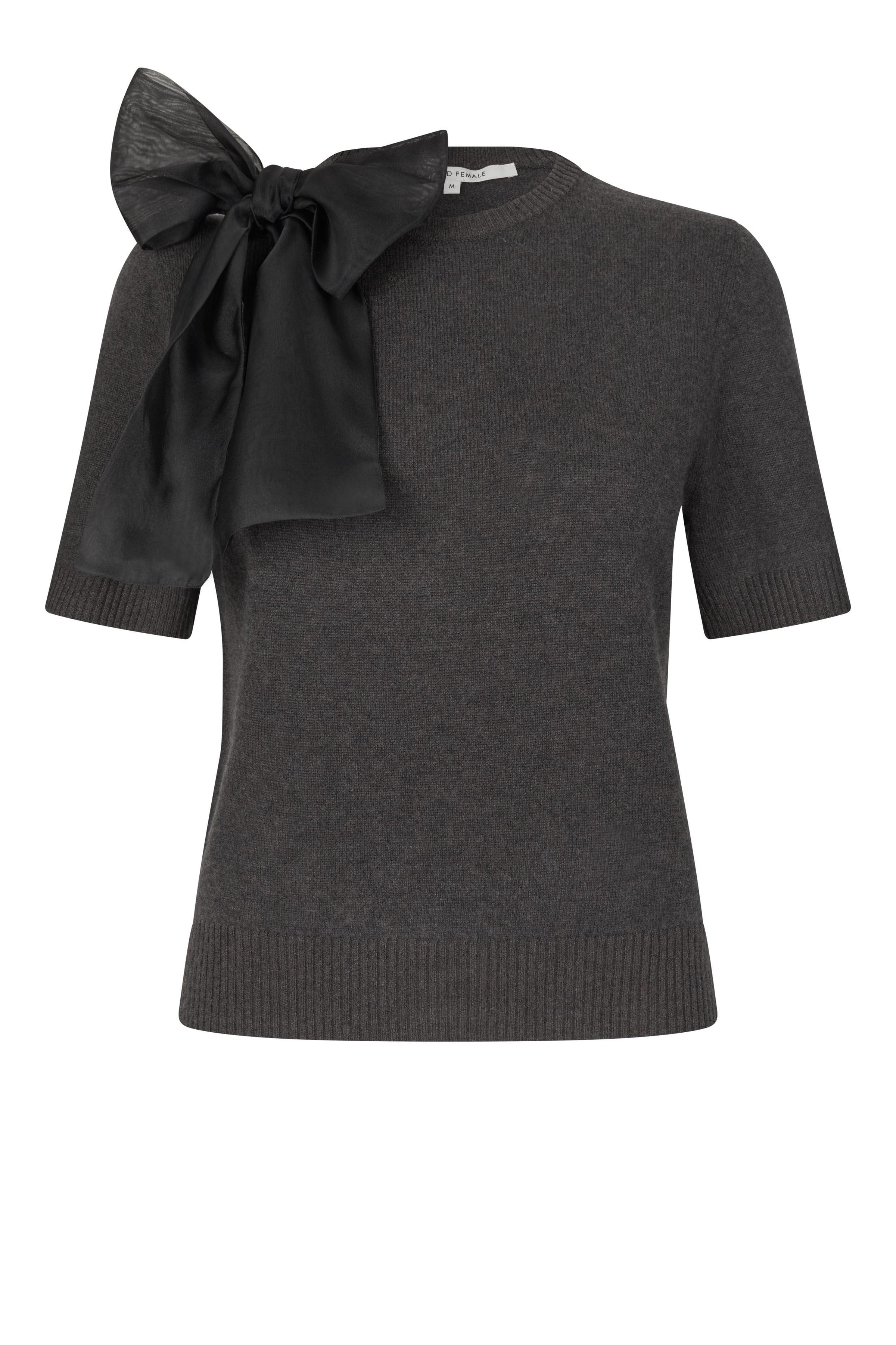 Second Female cashmere tee. Made in an ultra soft wool-cashmere blend. Featuring a round neck and short sleeves. Detachable chiffon bow. Regular f