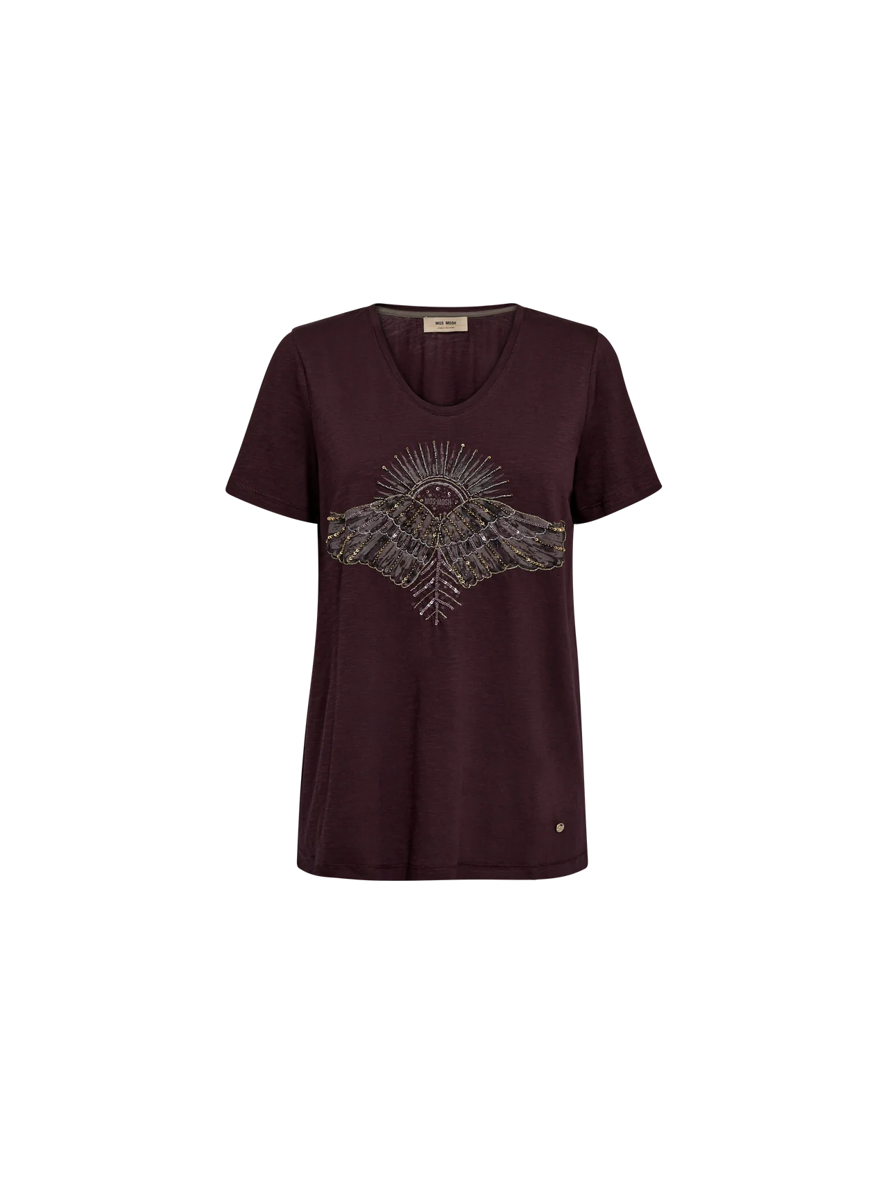 This beautifully fitted tee showcases intricate detailing at the front, making it a true standout piece. Featuring a striking combination of hand-beaded and embroidered artwork, it highlights angel wings and a radiant sunburst design for an artistic touch. Wear it with jeans for an effortlessly chic outfit or layer it under a blazer for a sophisticated, polished look.