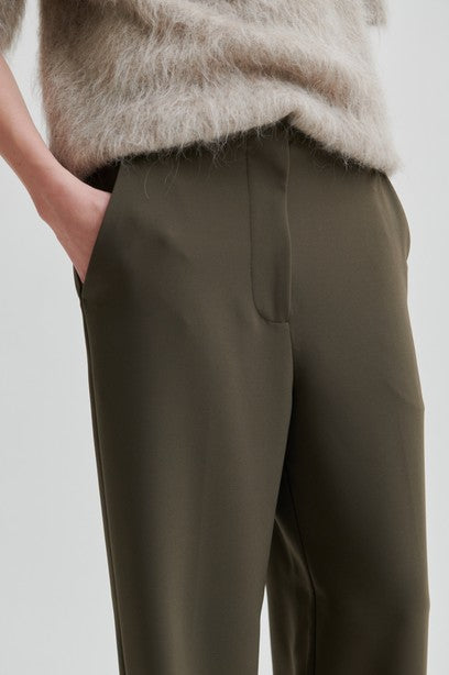 Second Female classic trousers. The trousers are made in a light fabric with drapy quality. Featuring a concealed zip, hook and button with elastic at back of waist. Two front pockets and decorative back pockets. Mid waist with wide, straight legs