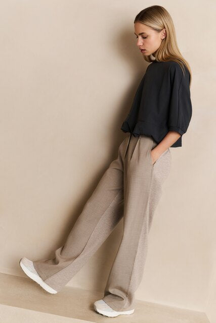 This contemporary top features a round neckline, short sleeves, and a loose fit. The visible cut seam and elasticated balloon hem add a playful touch to the silhouette. Made from a smooth, soft fabric that offers all-day comfort. A refined and versatile piece that pairs easily with both casual and dressed-up styles. The model is 175 cm and wears size 36.