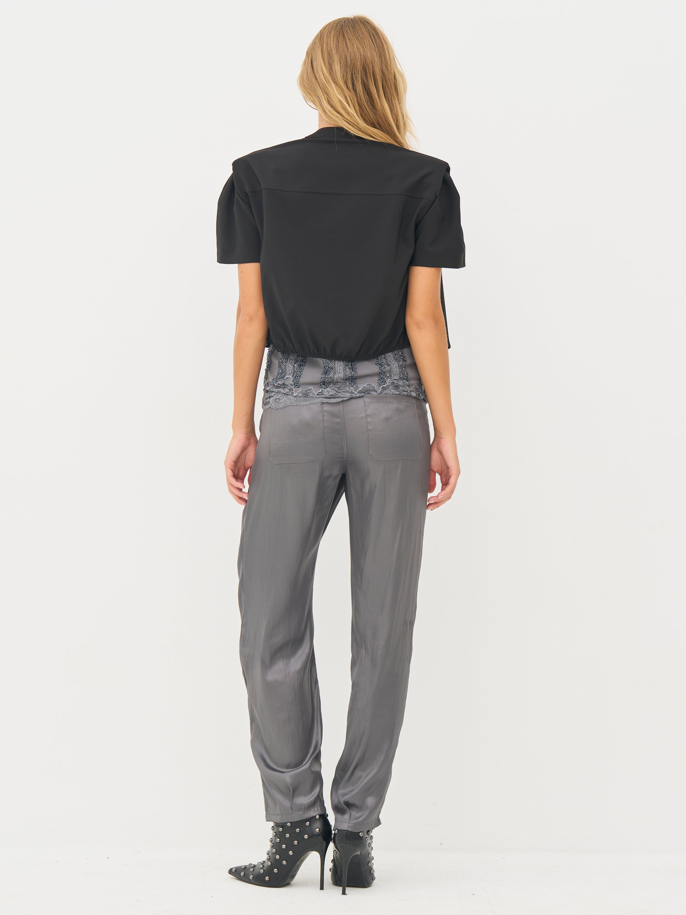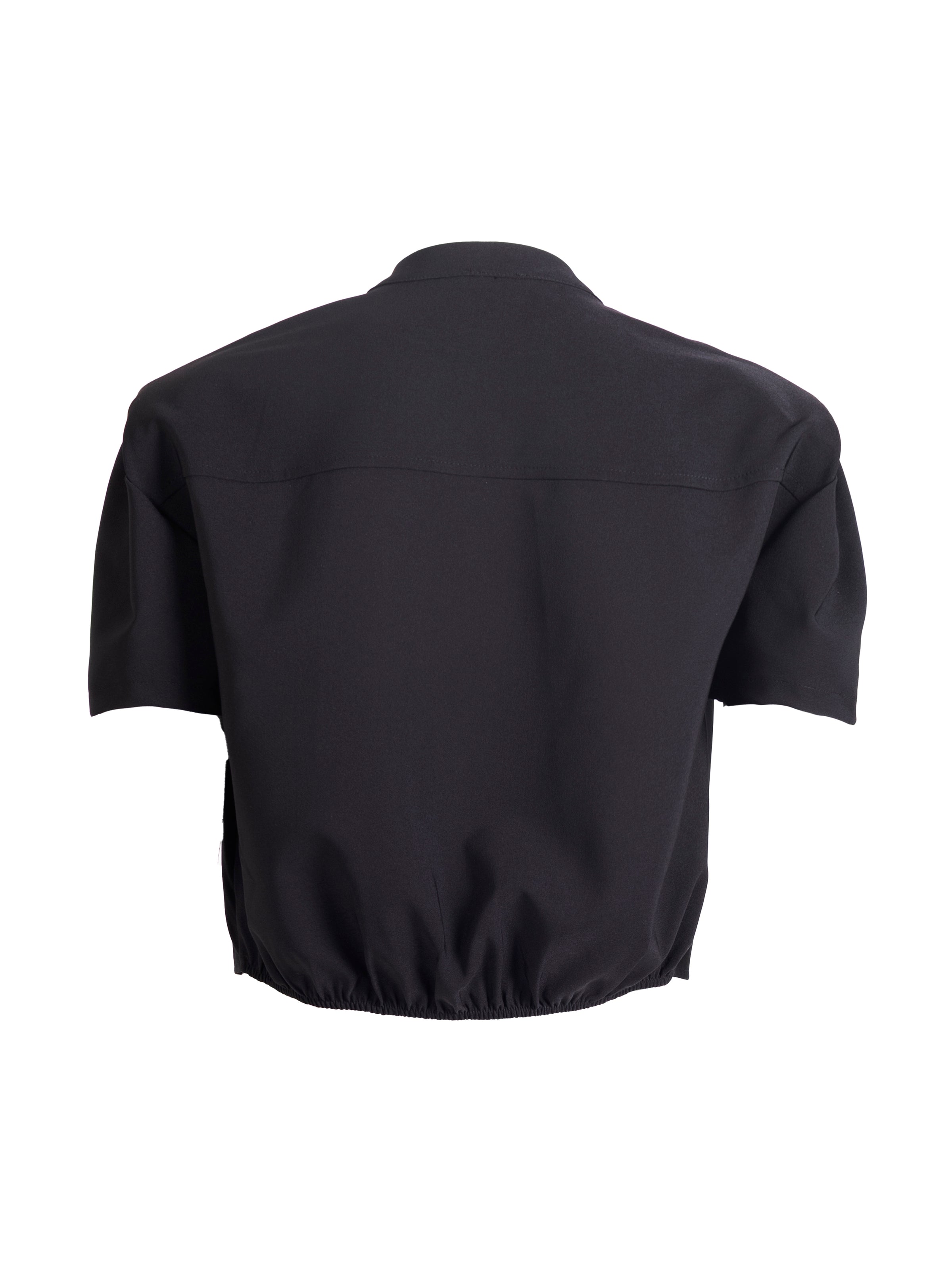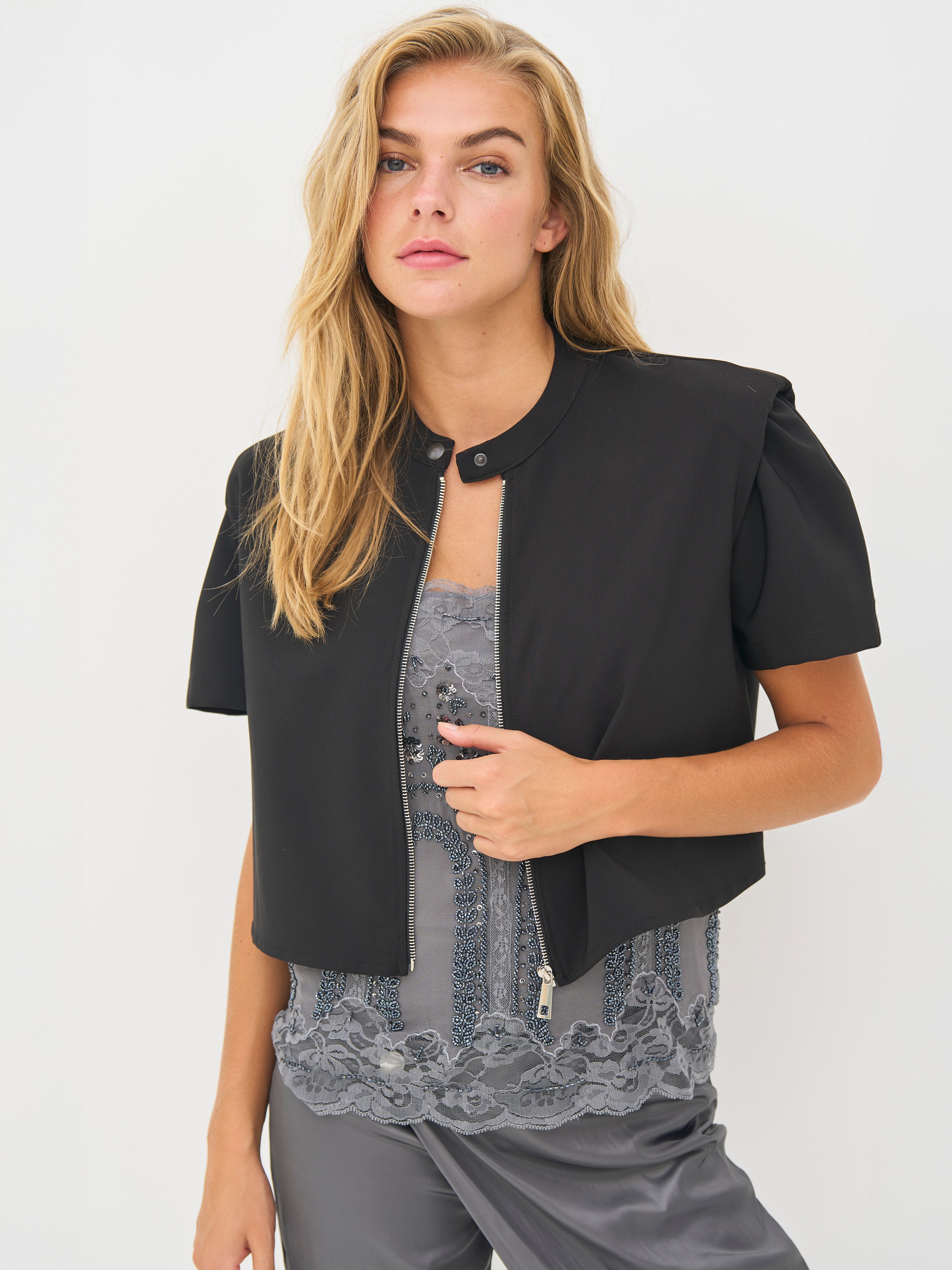 Give your outfit a modern twist with this short bolero jacket that combines structure and simplicity. The jacket features short, subtly defined sleeves and a full-length zipper at the front, adding a cool and sleek expression. The elastic hem at the bottom creates a slightly rounded fit, making it both comfortable and flattering.