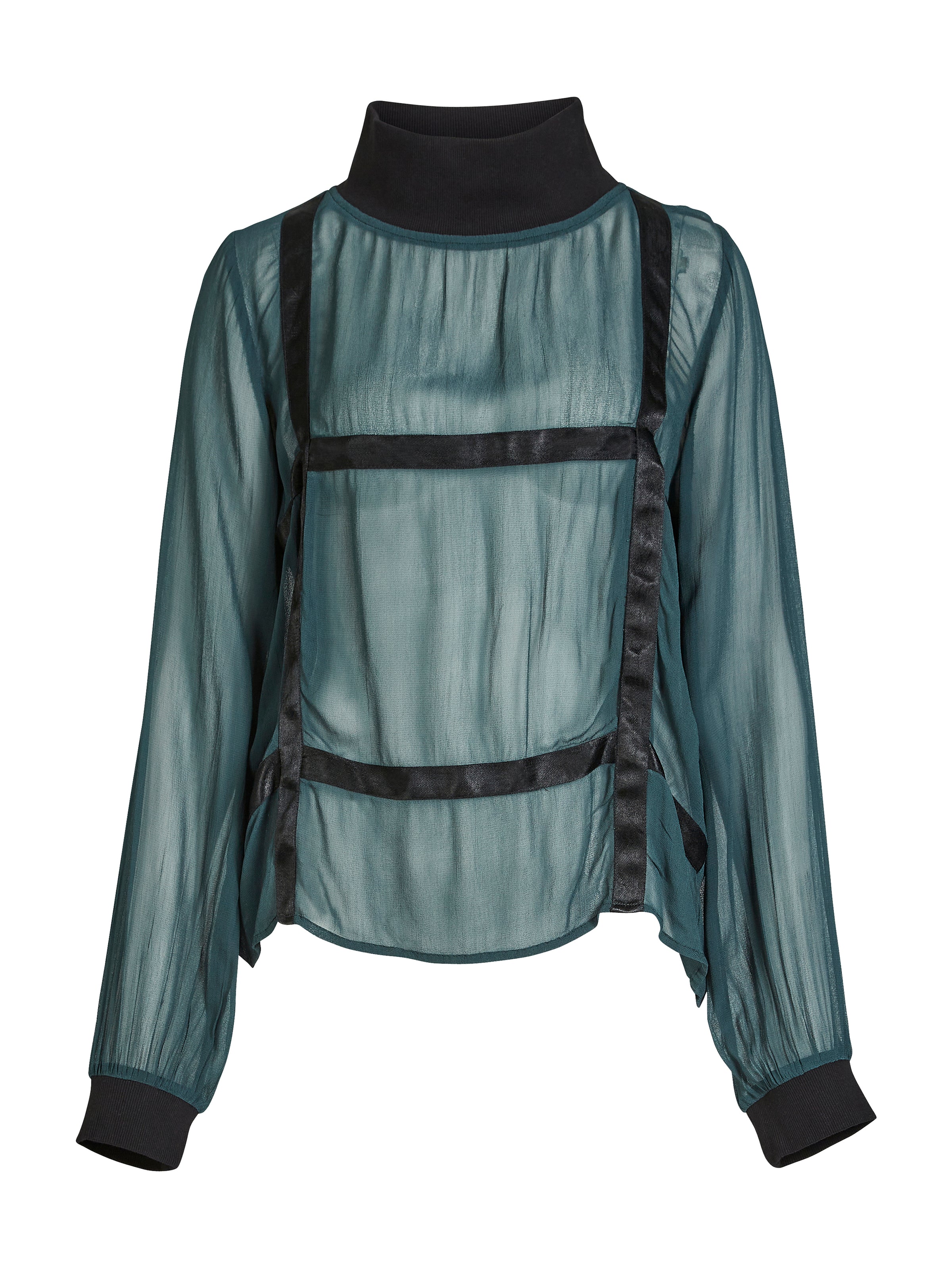 Stand out in this stylish blouse in light transparent material with prominent contrast bands. It features long sleeves with rib cuffs and a high, soft ribbed collar, providing a sporty and modern contrast to the feminine fabric. The wide bands create a graphic effect and emphasize the unique design of the blouse.