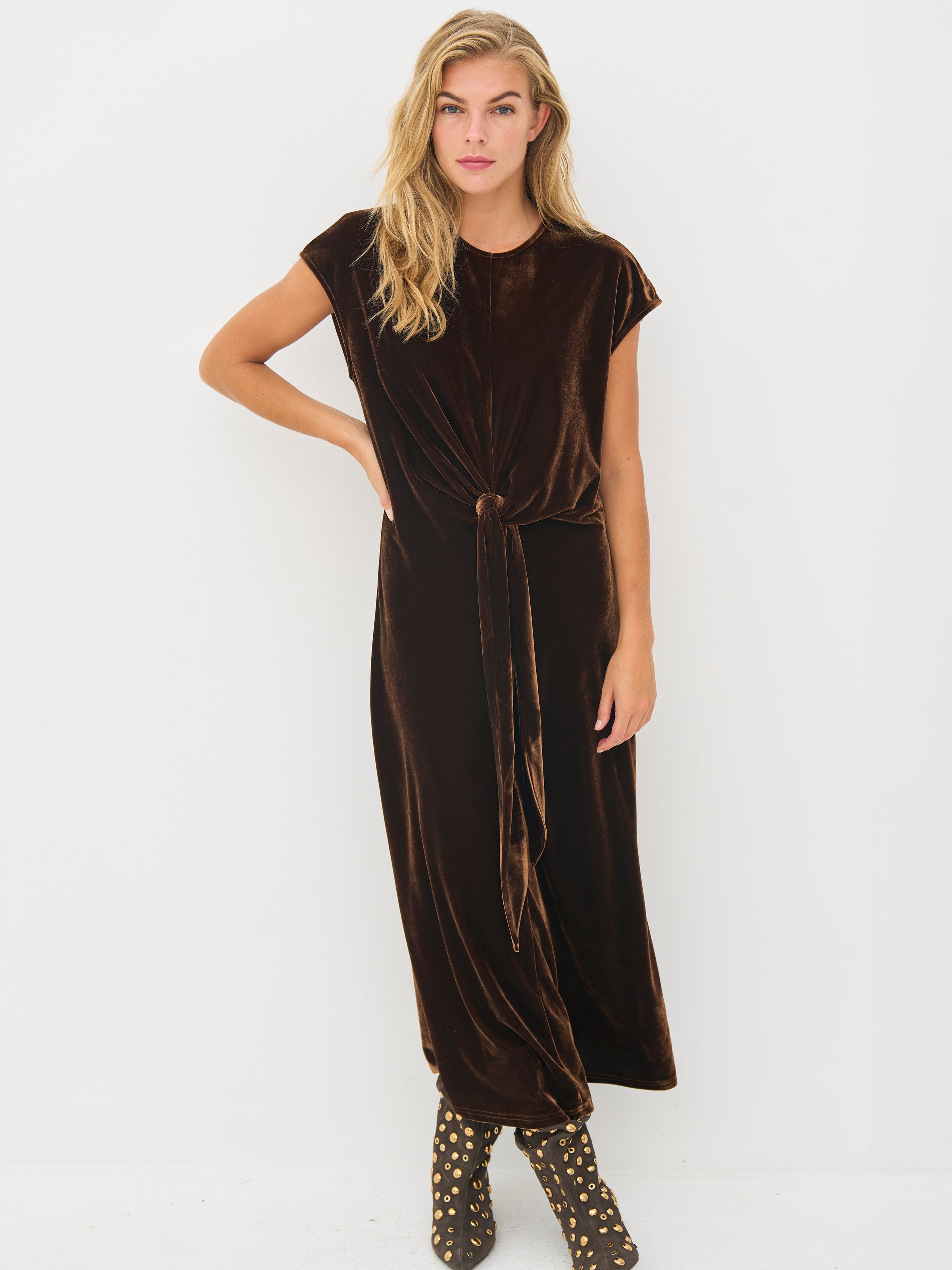 This dress has a simple and elegant cut, highlighted by the soft, velvety material with a beautiful drape. It features short sleeves, a round neckline, and a wide tie belt at the waist that can be styled in various ways to create variation in the look. The long, straight silhouette gives a relaxed yet refined expression.