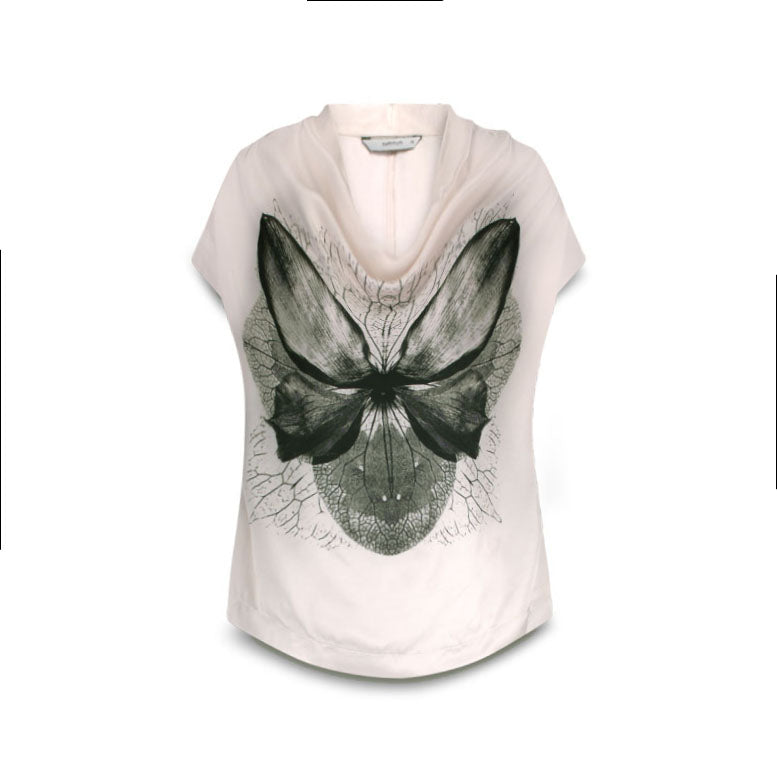 Add a touch of statement style to your wardrobe with this Butterfly Print Blouse in white. Crafted from a lightweight fabric, it features a flattering draped neckline and relaxed short sleeves, making it both comfortable and effortlessly chic. The bold monochrome butterfly motif across the front adds a striking, artistic edge while keeping the look versatile and modern.