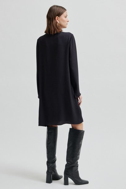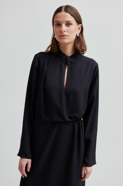 Second Female dress with waist detail. Made in a smooth viscose blend. Featuring a keyhole opening at the front with button fastening. Pleat at one shoulder and gathers at one side to create symmetric draping. Long sleeves. Regular, straight fit.