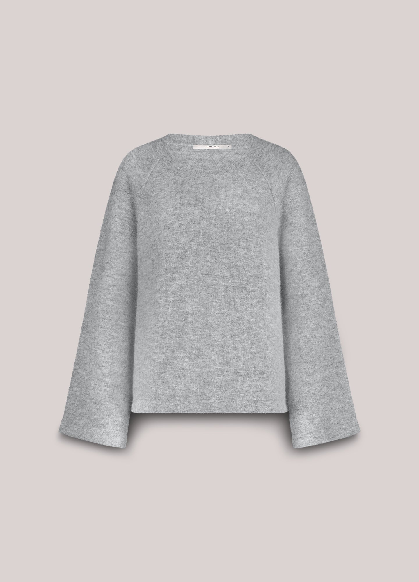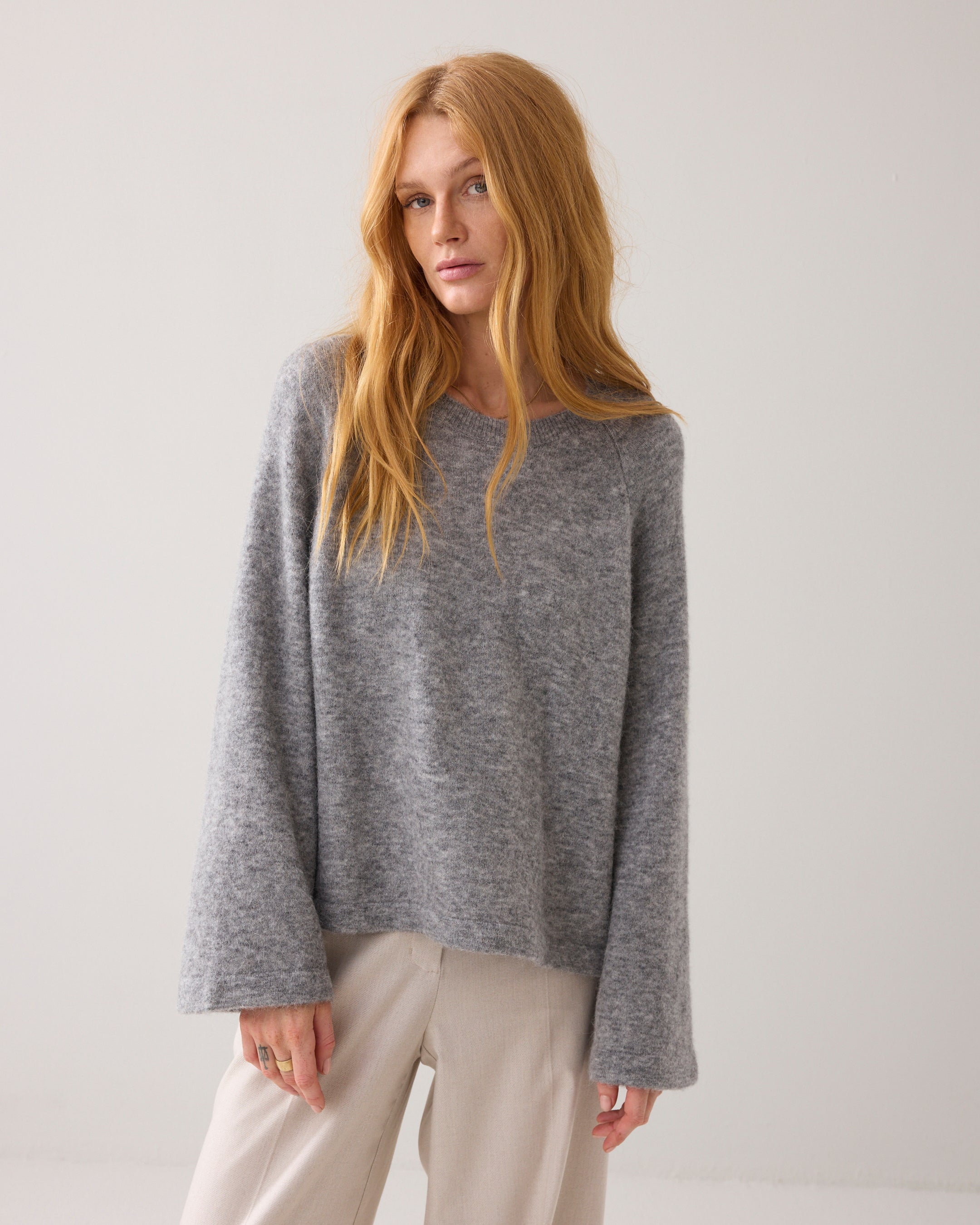 Oversized boxy jumper with raglan sleeves and a round neckline. The jumper has a slightly velvet look thanks to the alpaca-blend yarn. The wider sleeve has a lowered inset.