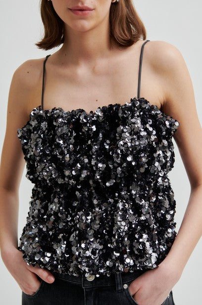 Second Female sequin strap top. The top features different-sized sequins on a tonal background. Thin straps with adjustable buckles and elasticated seam under bust. Fully lined. Slim fit.