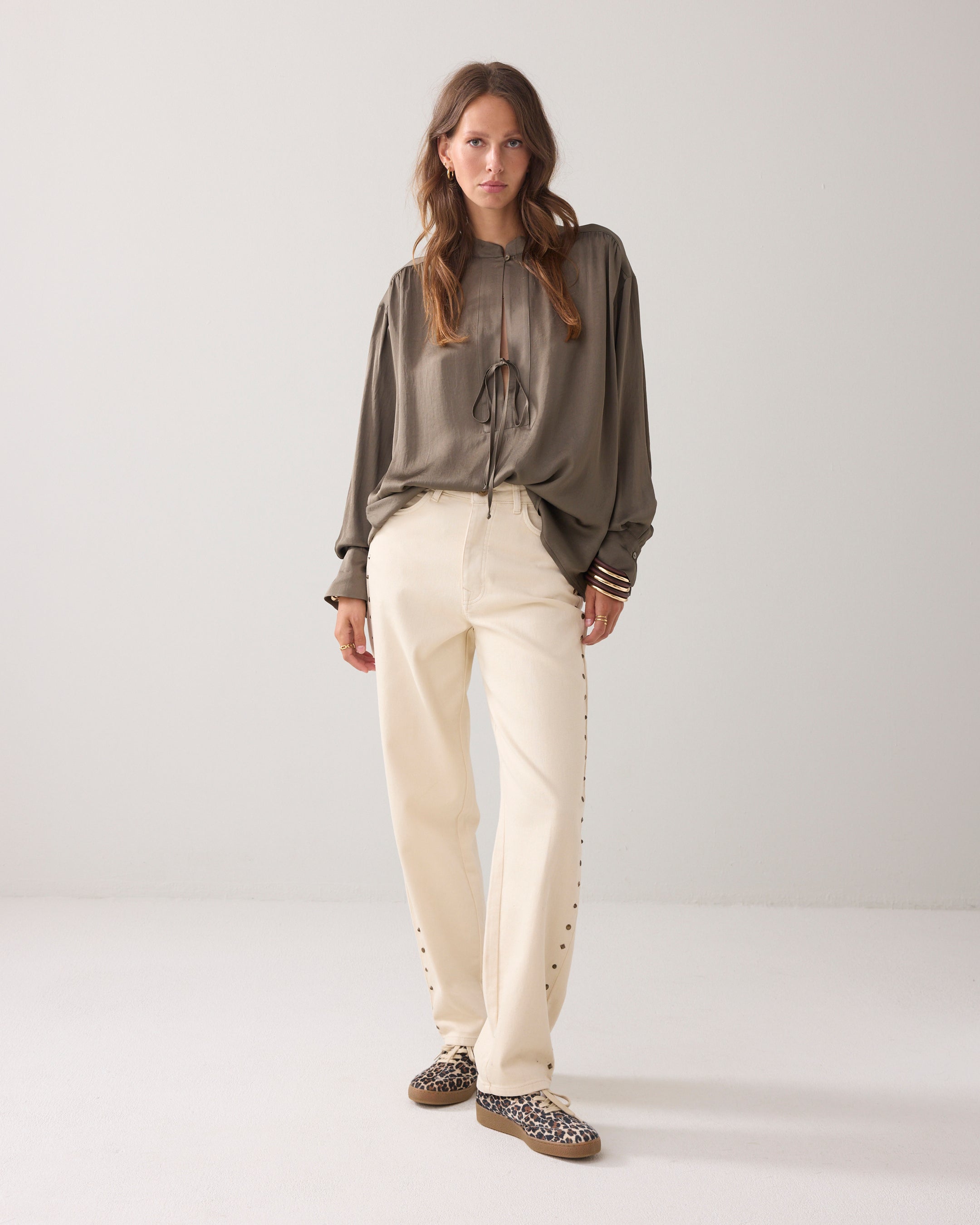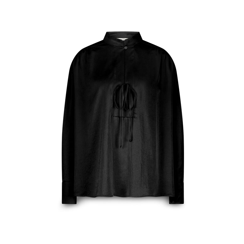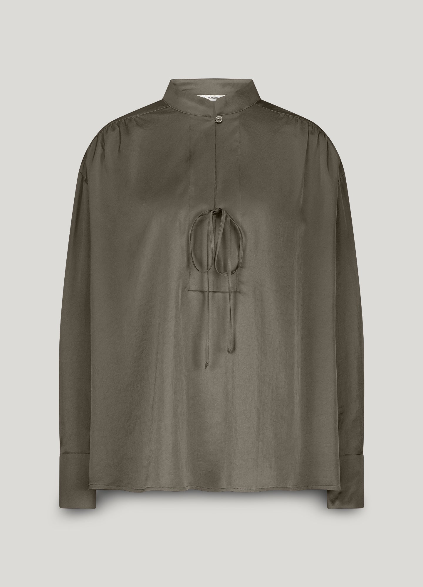 This wide-fit top in soft, shiny fabric has a deep slit with a bow fastening at the chest and a button on the stand-up collar. The top has a lowered sleeve inset, wide buttoned cuffs and a gathered back panel.
