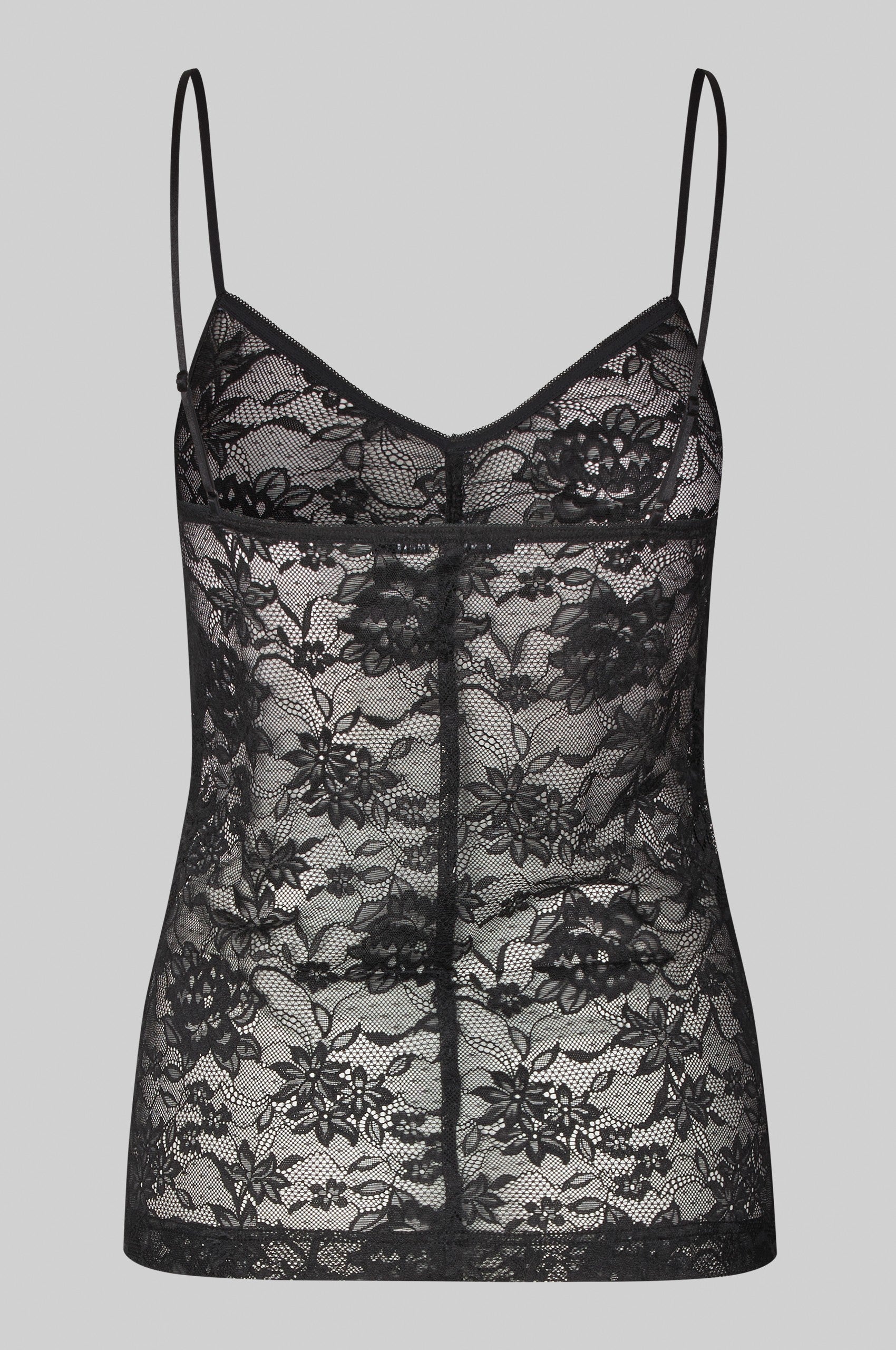 Second Female lace strap top. The top is made in sheer stretchy lace. Featuring a V-neck and thin adjustable shoulder straps. Elasticated gathered seam at the front. Tight fit.
